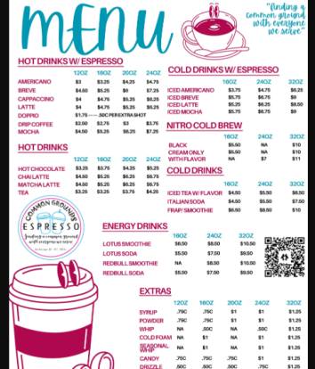 What are common cafe menu items? Menu standar yang biasa ada di kedai kopi termasuk Common Grounds: