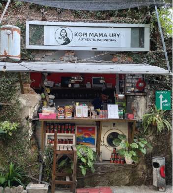 Belok kiri masuk ke gang tersebut. Lokasi Kopi Mama Ury tepat berada di ujung gang, mudah terlihat dengan dekorasi outdoor yang khas dan papan nama kedai yang cukup besar.